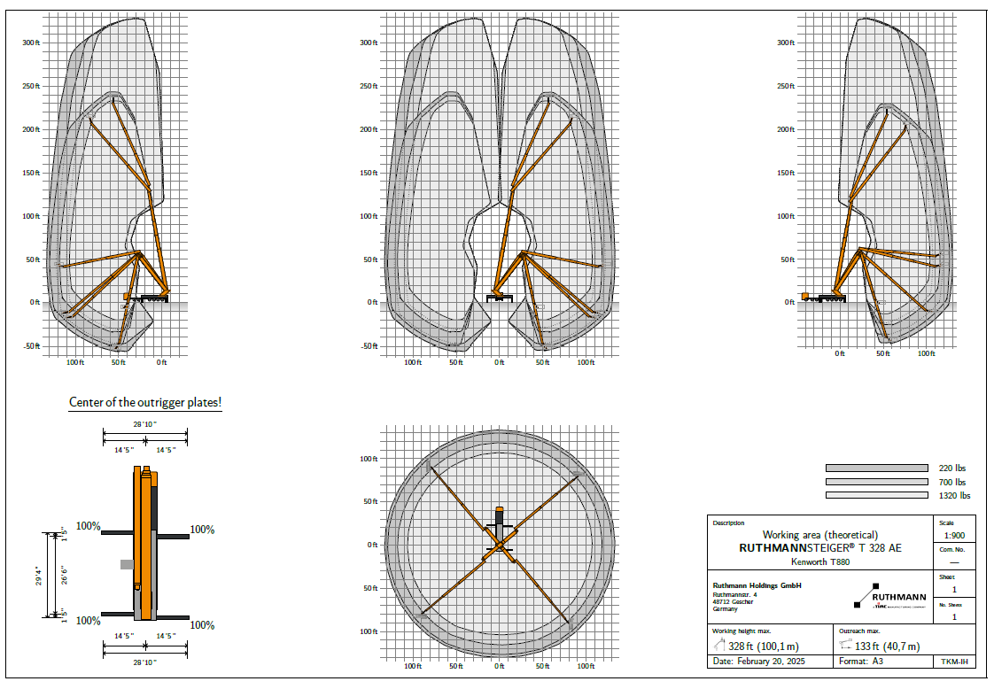 Ruthmann Steiger T-328AE high access work platforms offer 328’ (100m) of working height, 133’ (40.7 m) of horizontal reach and 55’ (17 m) of below-grade reach. With auto-outrigger setting and leveling, and 1,300 lb. (590 kg) platform capacity, this unit comes with selectable wind speed ratings up to 43 mph (19 mps). The T-328AE offers smooth operation, with multi-bevel boom shape and high resolution COCKPIT intelligent control system. The T-328AE meets the EN280 standard compliance.